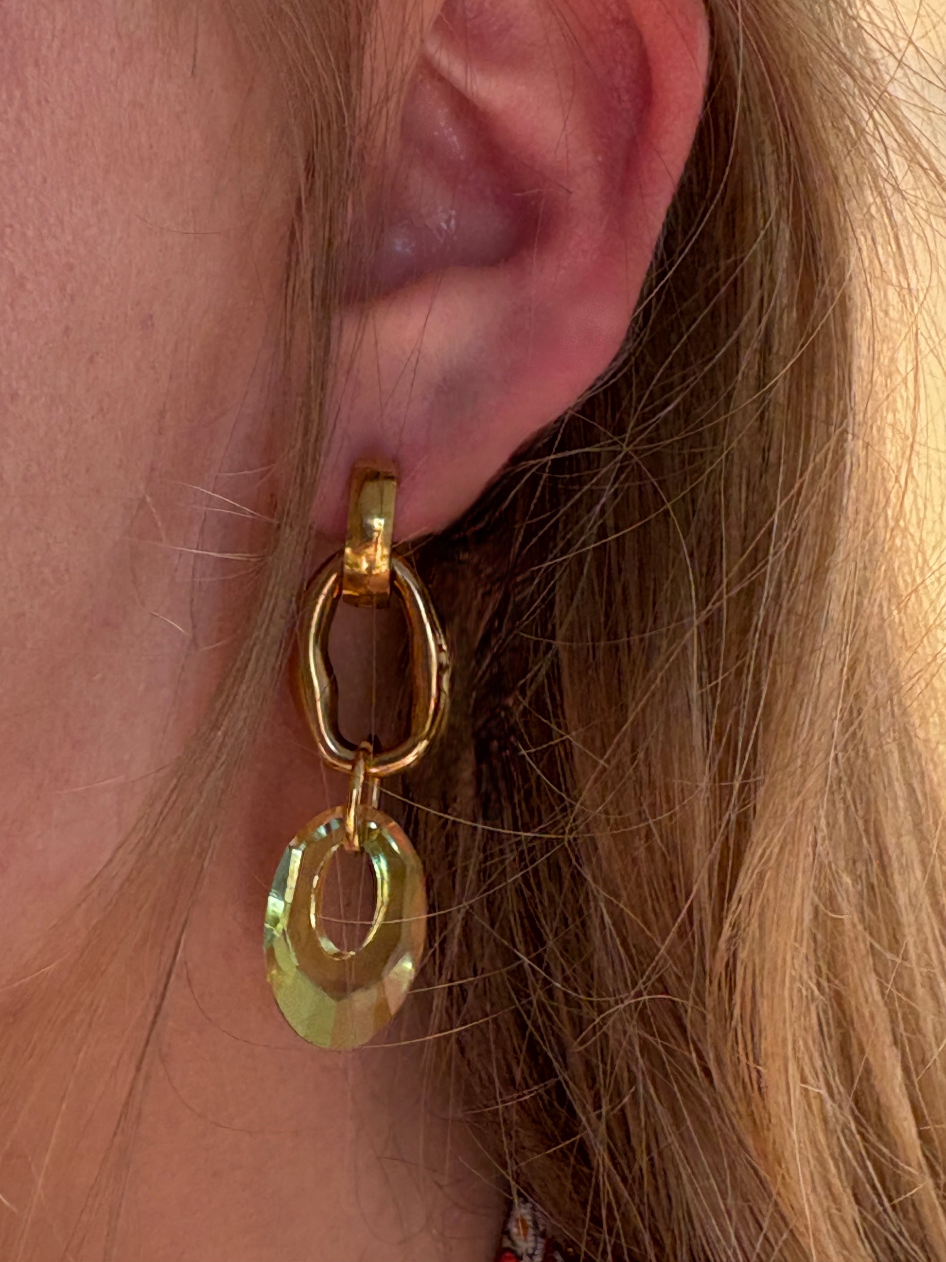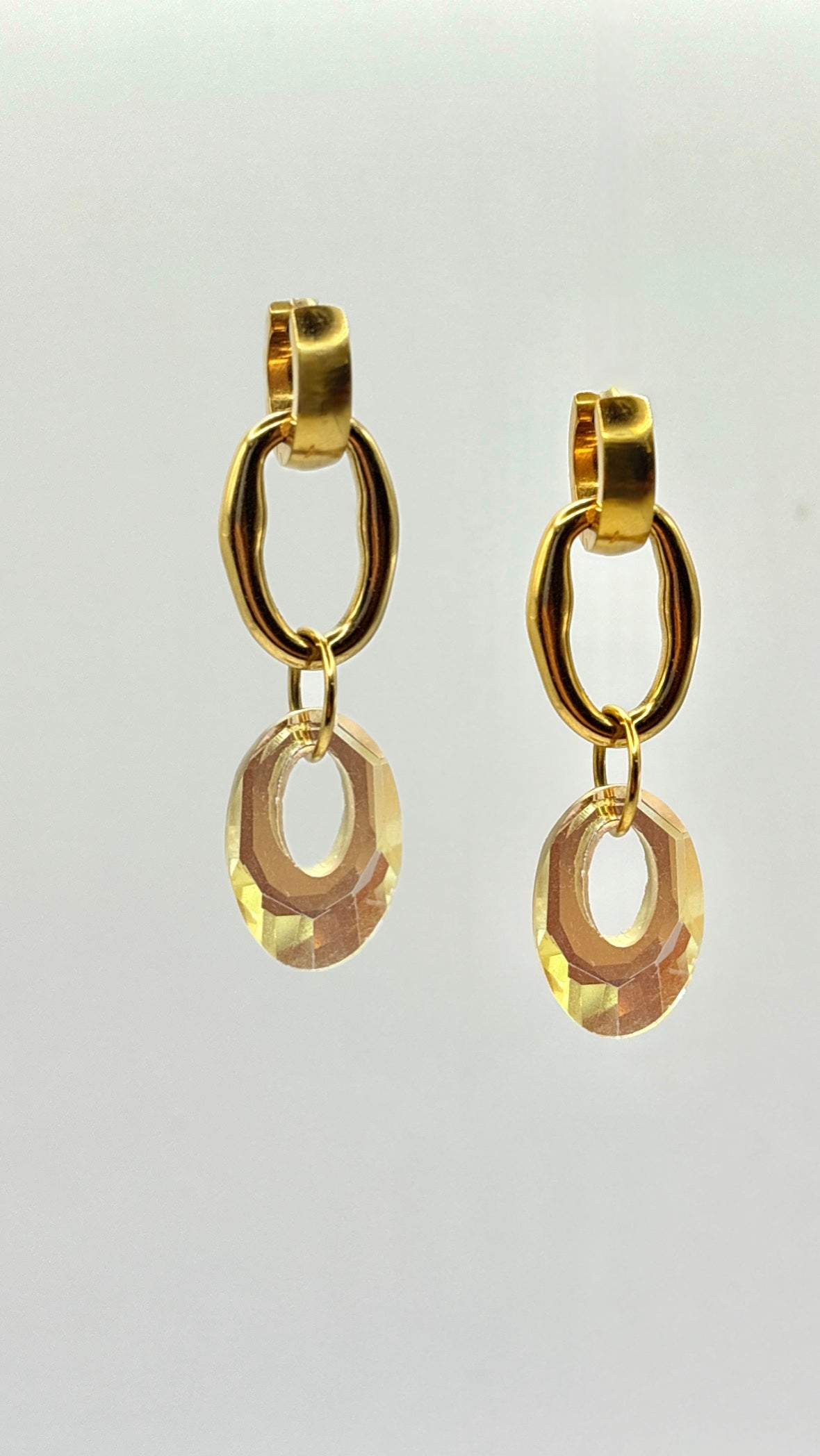Les boucles sont fabriquées en acier inoxydable doré, un matériau solide, durable et résistant à la corrosion. Hypoallergéniques, elles conviennent parfaitement aux peaux sensibles. Le pendentif est orné d’un cristal facetté qui capte la lumière et offre de magnifiques reflets.
