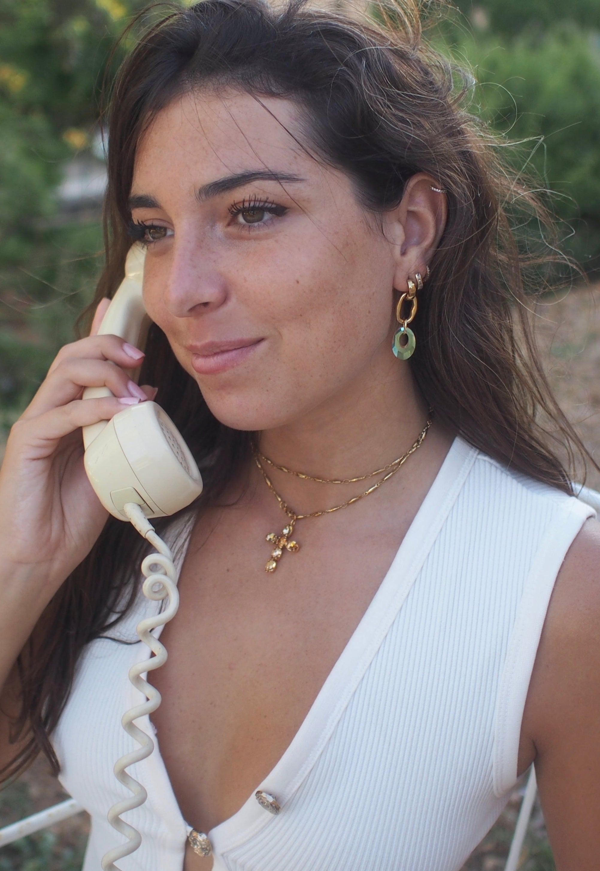 La boucle d’oreille Muse se distingue par son design élégant et moderne. Un anneau doré en acier inoxydable rehaussée d'un cristal lumineux s’enchaîne harmonieusement. Ce bijou apporte une touche sophistiquée et intemporelle à toutes vos tenues, du quotidien aux occasions spéciales.