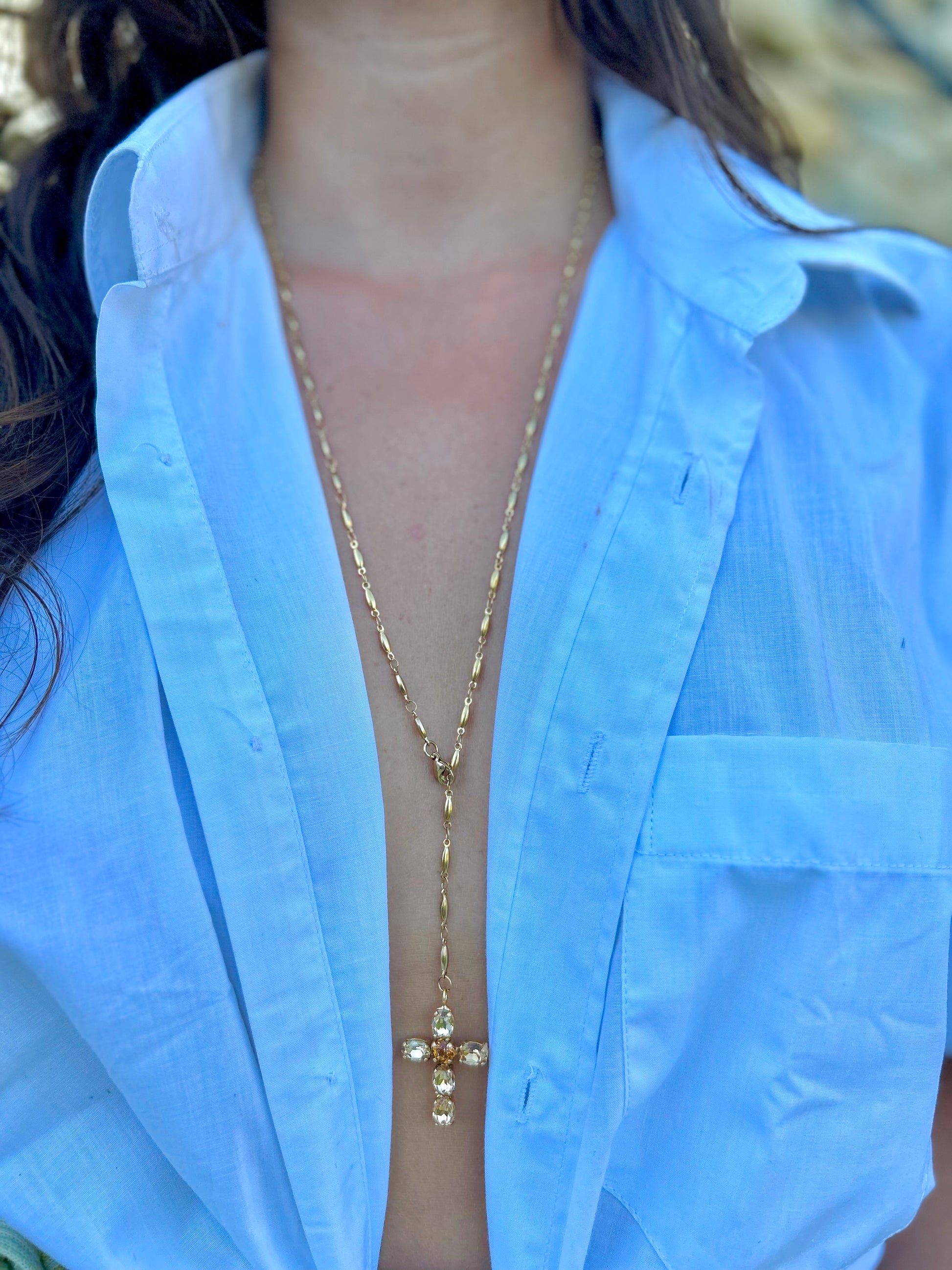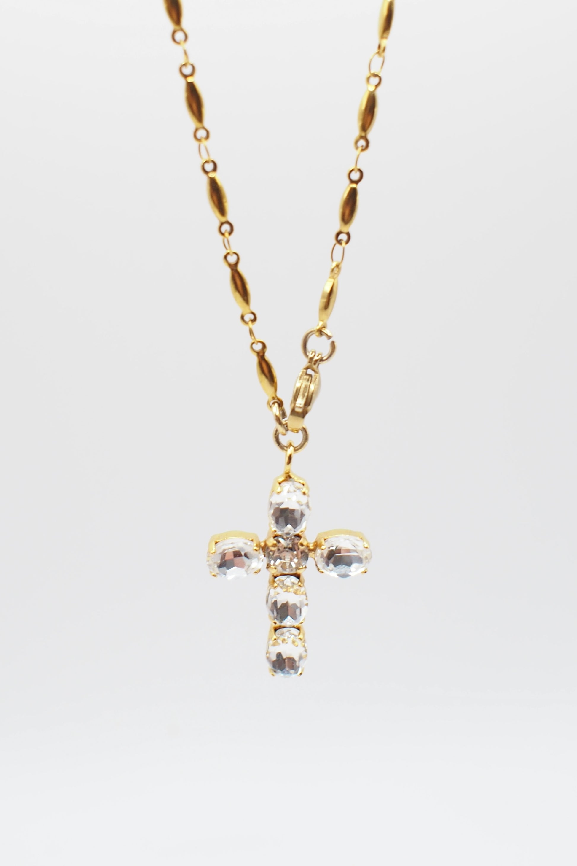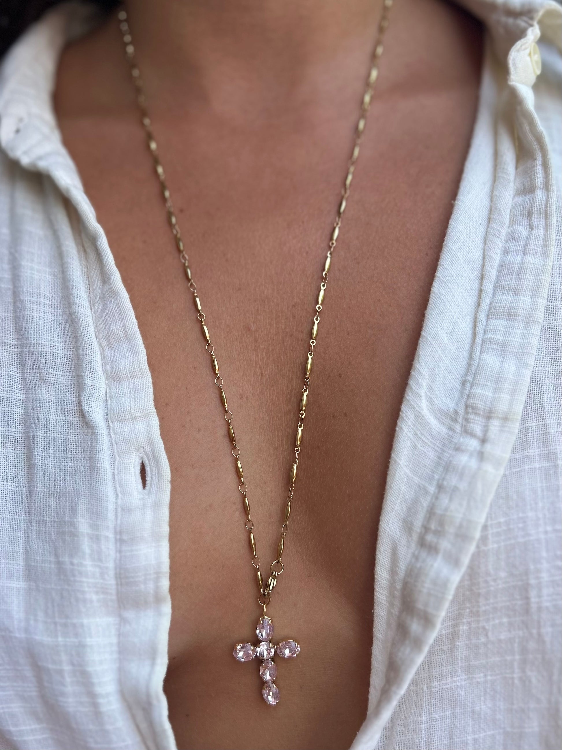 Un sautoir fin et léger, sublimé par une croix délicatement ornée de cristaux.