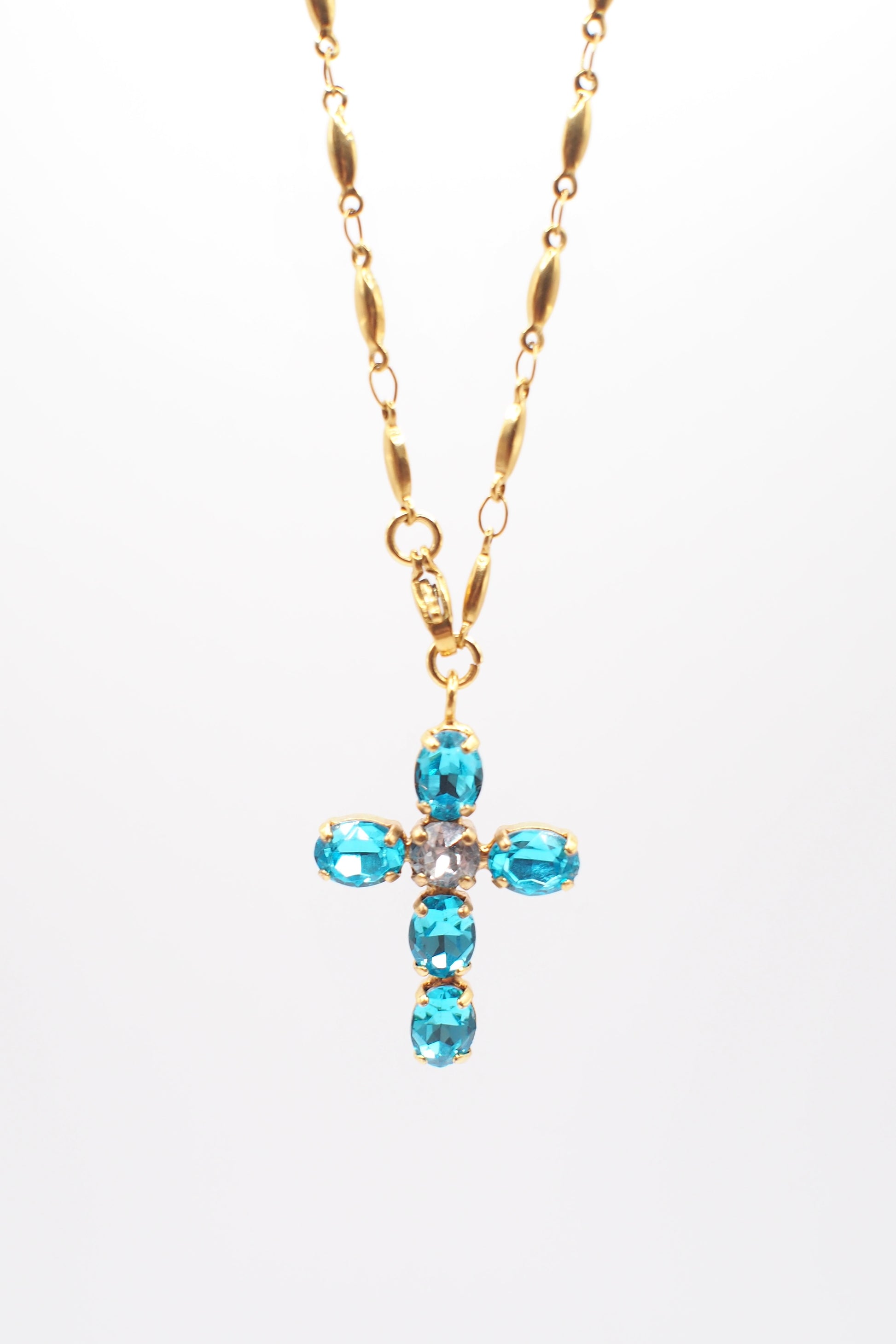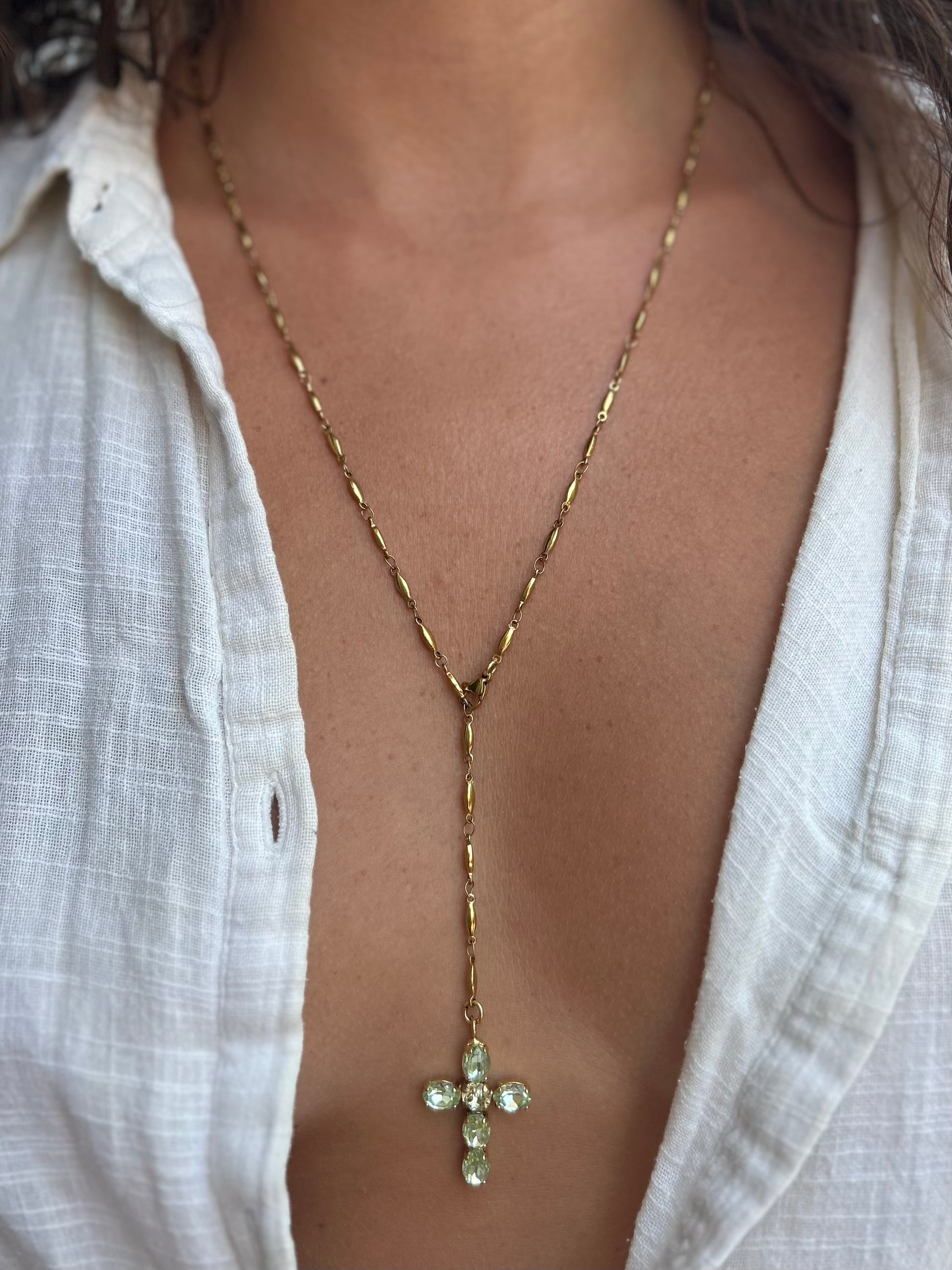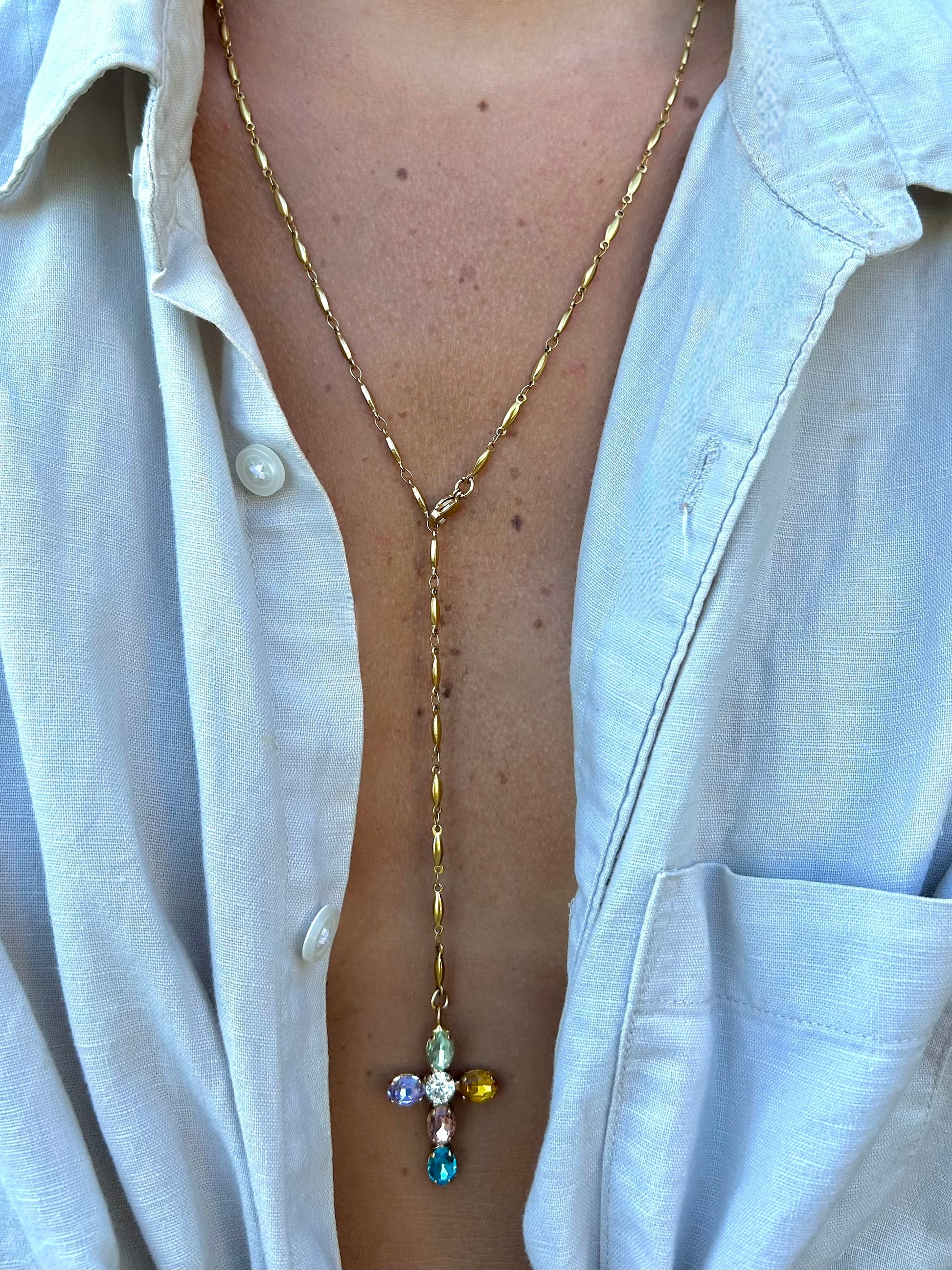 Un sautoir fin et léger, sublimé par une croix délicatement ornée de cristaux.