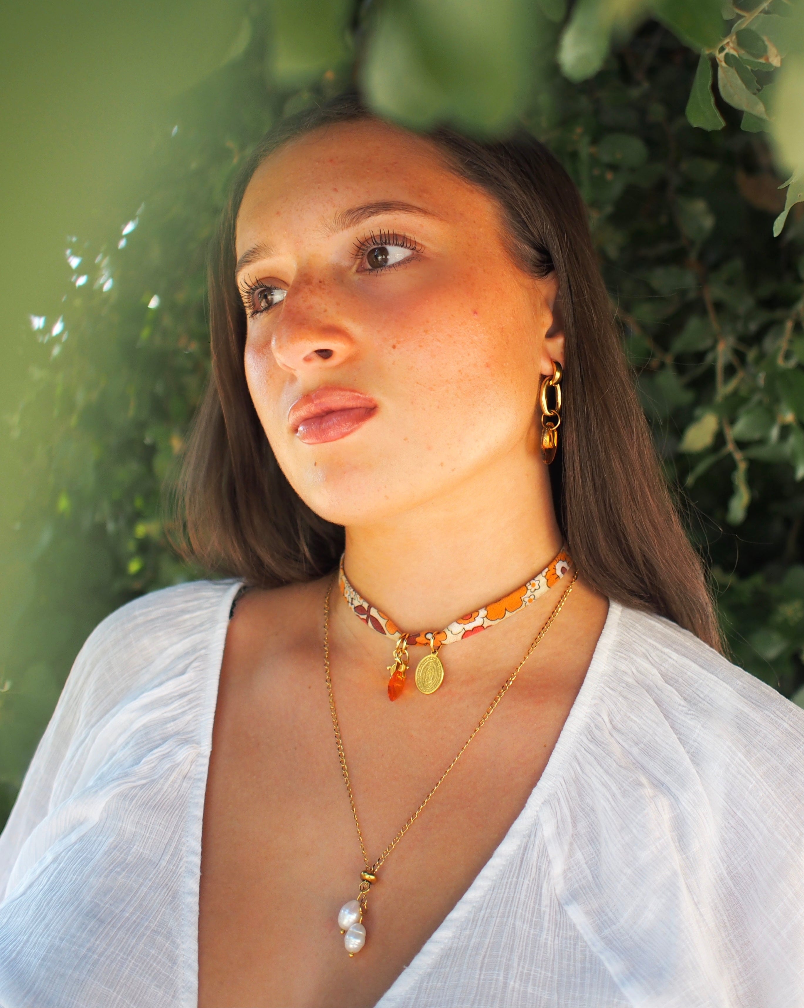 Collier de 50 cm, ajustable grâce à sa perle coulissante, permettant de faire glisser les perles à la longueur souhaitée. Il s’adapte à tous les ports de cou.